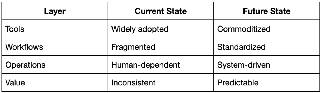 The highest-value position is not at the tool layer but at the operational layer that connects everything together:
