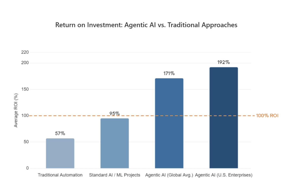 The returns on agentic AI are outpacing earlier automation technologies by a wide margin, with the global average ROI sitting at 171%. In the U.S., enterprises report 192%, which is roughly three times what traditional automation delivers.