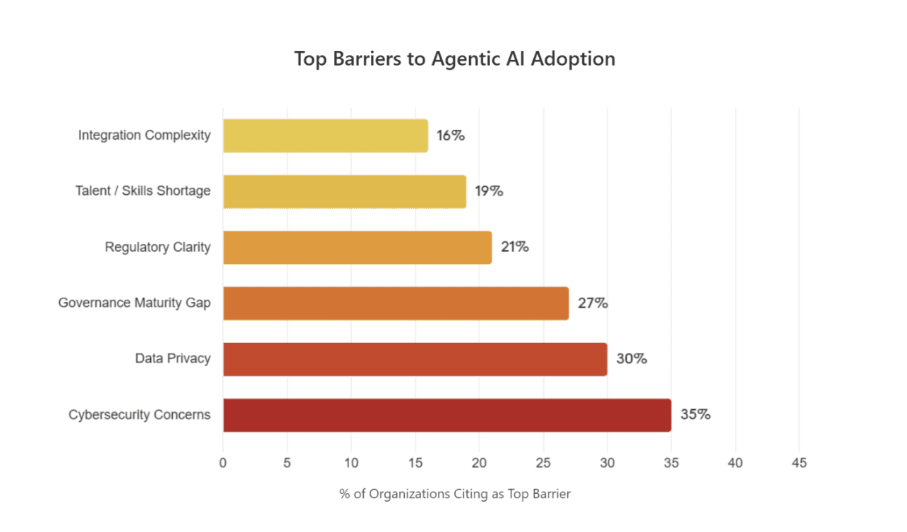 Most organizations are worried about cybersecurity, sitting at the top with 35%. This does fundamentally make sense, as agents need access to important systems to do their jobs, and every connection to these API tools is another hack waiting to happen. Furthermore, since organizations still don’t have a clear answer on what type of data is safe to provide, this creates the case for data privacy at 30%.