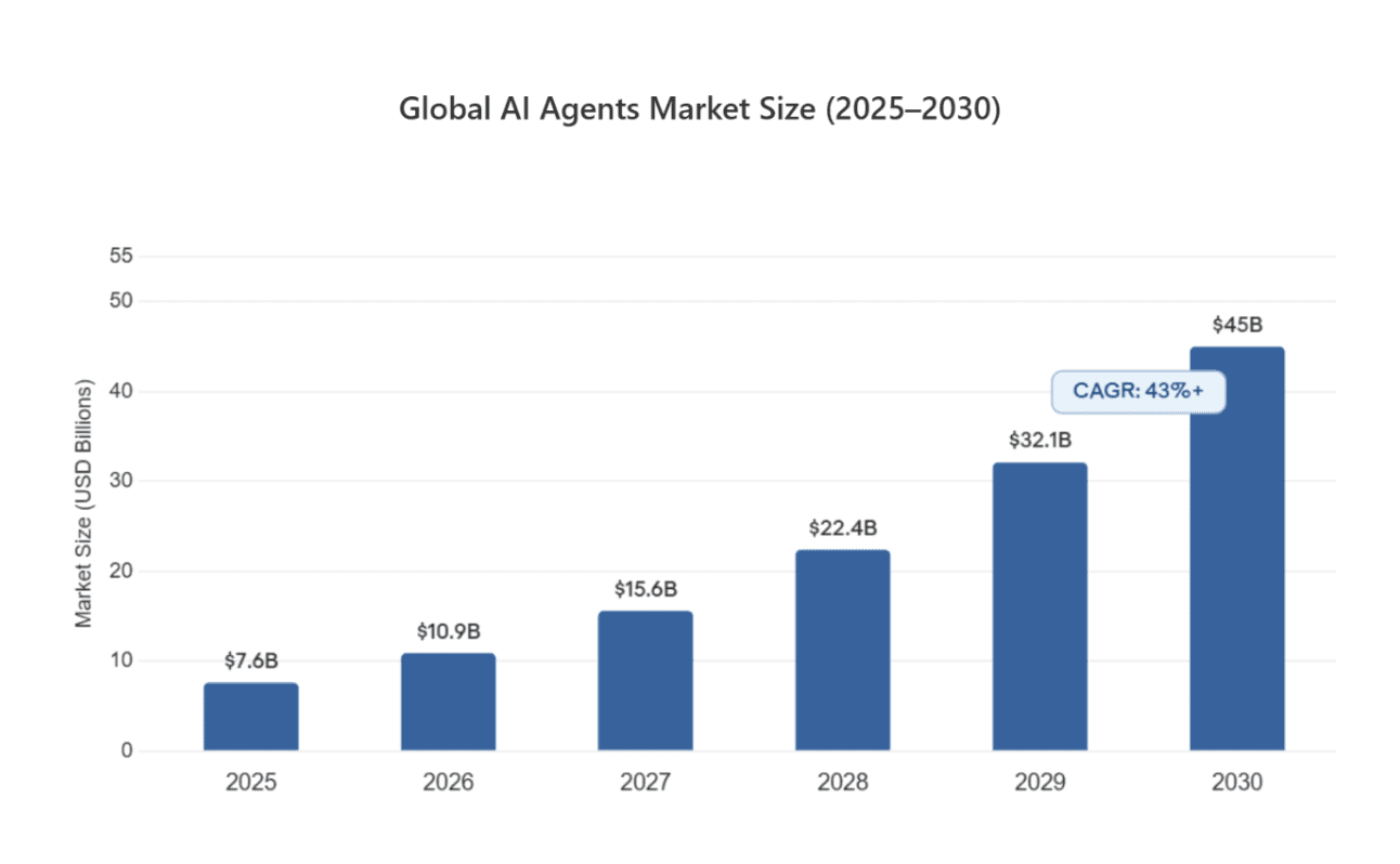The industry numbers on AI agents are large and growing fast. The market went from $7.6 billion in 2025 to a projected $10.9 billion in 2026, and could reach $45 billion by 2030 if companies figure out how to orchestrate agents well.