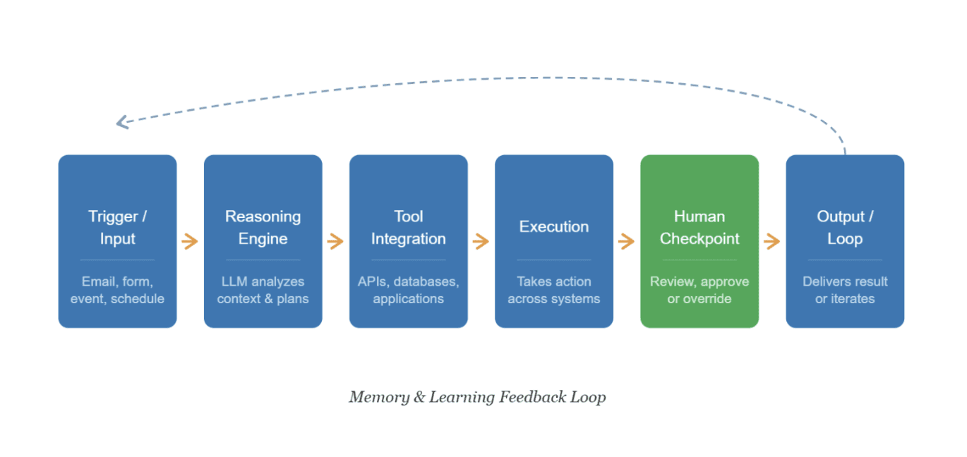 A trigger tends to start the process, such as an incoming email, a form submission, a scheduled time, or a signal from another process or system. Unlike traditional automation, the trigger does not need to be structured data since agents can read a natural-language email and figure out what to do with it.