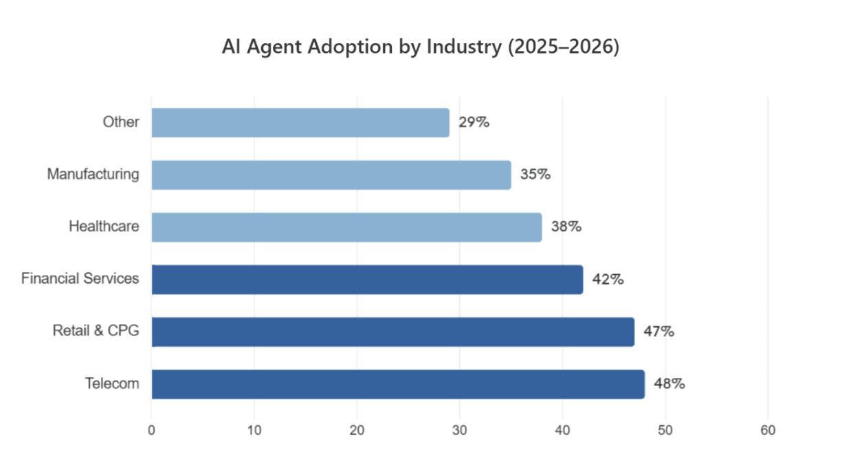 Telecom is at 48%, retail and consumer goods at 47%, and financial services at 42%, with those being active deployments. The share of enterprises exploring or piloting is higher still: 79% of organizations reported some level of agentic AI adoption as of late 2025.